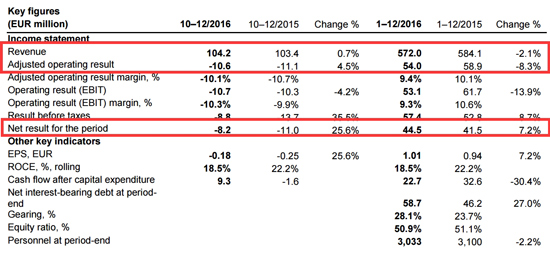 【中國涂料采購網】2月9日,芬蘭迪古里拉(Tikkurila)發(fā)布了2016年度報告,報告顯示,2016年全年實現(xiàn)銷售收入為5.72億歐元,同比下降2.1%。營業(yè)利潤(EBIT)為5310萬歐元,同比下降13.9%。凈利潤為4450萬歐元,同比增長7.2%。