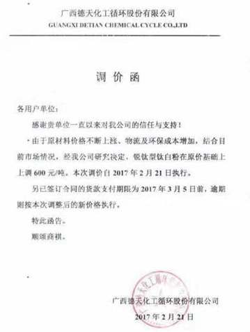 廣西德天化工循環股份有限公司決定在2017年2月21日因材料價格上漲影響,銳鈦型鈦白粉在原價格基礎上上調600元/噸。