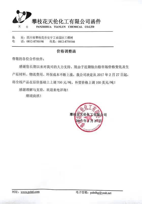 攀枝花天倫化工所有鈦白粉國內每噸上漲700元