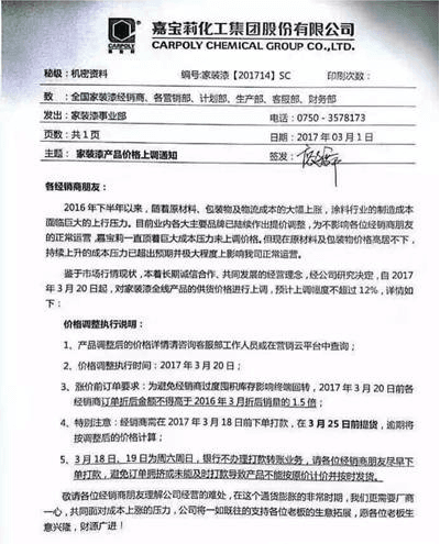 嘉寶莉表示,鑒于市場(chǎng)行情現(xiàn)狀,本著長(zhǎng)期誠(chéng)信合作、共同發(fā)展的經(jīng)營(yíng)理念,經(jīng)公司研究決定,自2017年3月20日起,對(duì)家裝漆全線產(chǎn)品的供貨價(jià)格進(jìn)行上調(diào),預(yù)計(jì)上調(diào)幅度不超過12%。