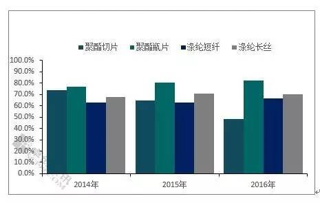 從最近三年的數據來看,2014-2016年,聚酯切片、滌綸短纖、滌綸長絲、聚酯瓶片平均開工率分別為62.1%、64.1%、69.6%、79.7%。其中,聚酯瓶片開工率保持在相對高位,主要是經濟波動對大量使用聚酯包裝的快速消費品行業影響相對較小,為聚酯瓶片提供了穩定的下游市場基礎。與此相比,由于紡織服裝行業不景氣,導致聚酯切片、滌綸短纖、滌綸長絲開工率嚴重不足,其中聚酯切片開工率表現最差又有切片紡市場份額萎縮的原因。