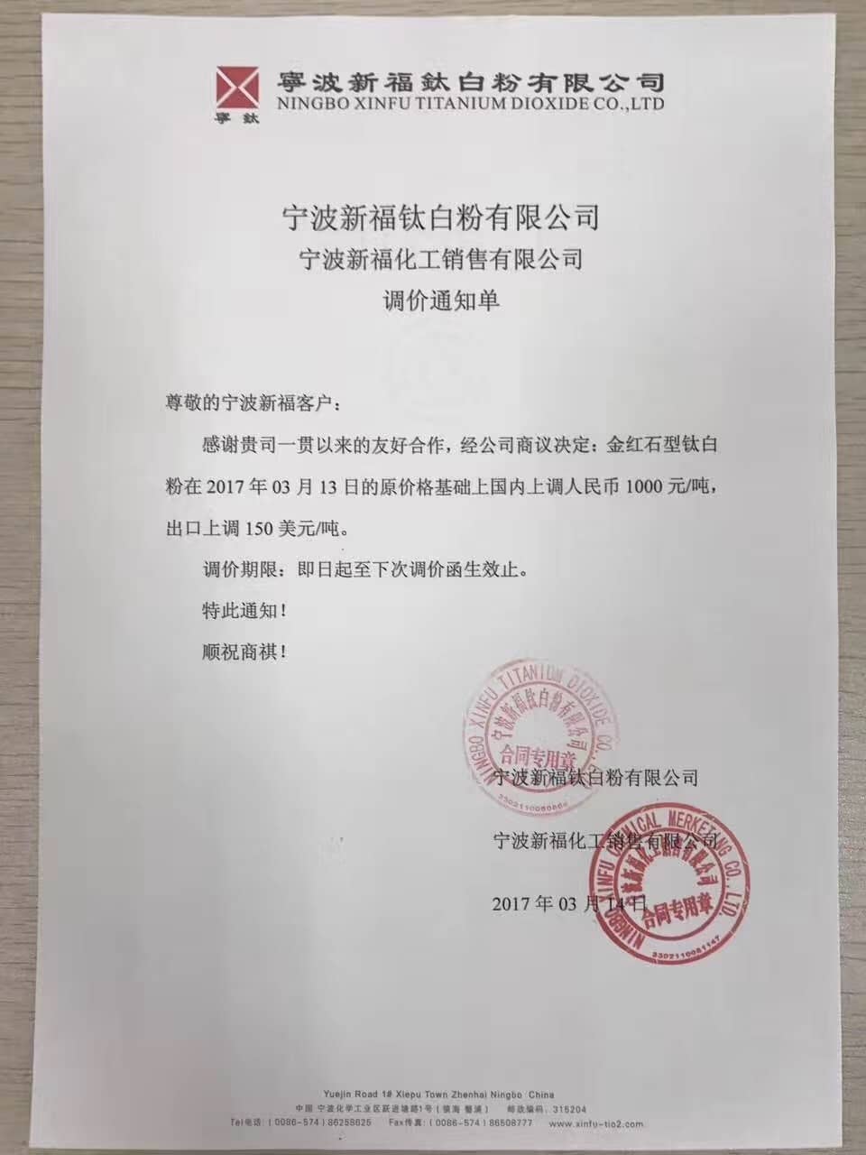 寧波新福有限公司對鈦白粉上調1000元/噸