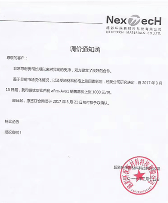 超彩環(huán)保新材料銳鈦型鈦白粉上漲1000元/噸