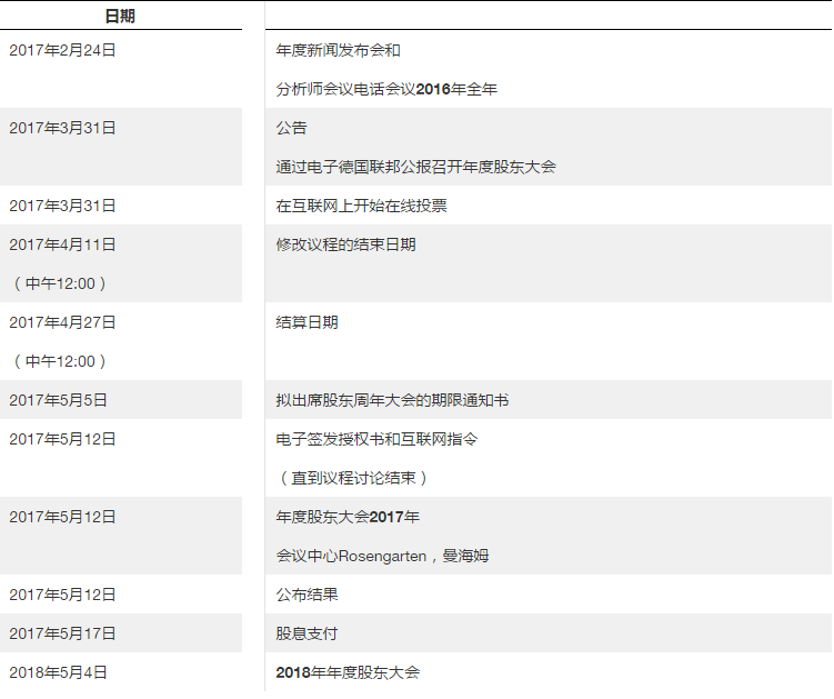 BASF SE年度股東大會將于2017年5月12日星期五上午10點在曼海姆Rosengarten會議中心舉行。