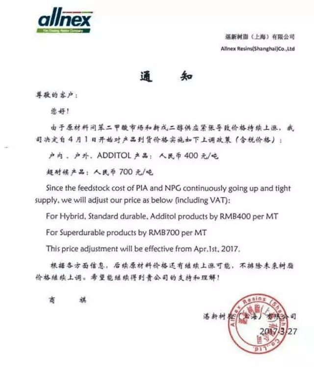 國外涂料企業相繼宣布漲價之后,國內原材料企業也迅速加入漲價的大潮中,3月27日,湛新樹脂(上海)有限公司,由于原材料間苯二甲酸市場和新戊二醇供應緊張導致價格持續上漲,決定自4月1日起,開始對產品到貨價格實施如下上調政策(含稅價格):戶內、戶外、ADDITOL 產品:人民幣400元/噸;超耐候產品:人民幣700元/噸;除了PPG、威士伯、湛新上調產品價格外,攀枝花天倫化工有限公司也發出調價通知,決定從2017年3月27日起,將全線產品在原價基礎上上調1000元/噸、外貿價格上調150美元/噸!