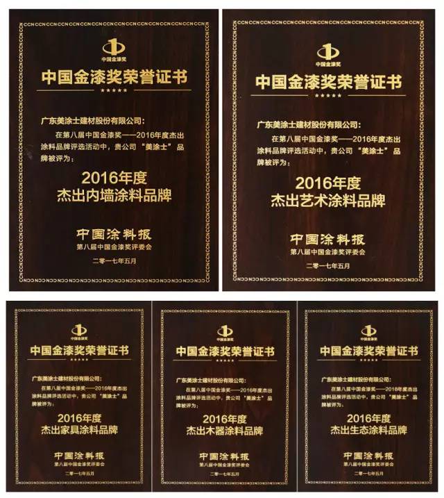 中國金漆獎秉承對高品質(zhì)的追求,至今已成為中國涂料行業(yè)最具影響力、最具公信力、最權(quán)威的年度品牌活動。美涂士在這次的評選中,攬獲“年度杰出內(nèi)墻涂料”、“年度杰出木器涂料”、“年度杰出家具涂料”、“年度杰出藝術(shù)涂料”、“年度杰出生態(tài)涂料”等五項大獎,充分體現(xiàn)行業(yè)對美涂士品牌的認可和贊譽。