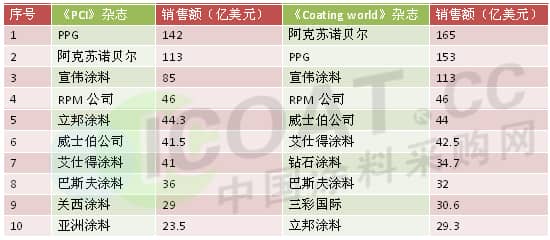 備注:《Coatings World》每年將涂料、黏合劑和密封膠生產(chǎn)企業(yè)混合排名,而《PCI》只針對(duì)企業(yè)的涂料銷售額進(jìn)行排名。