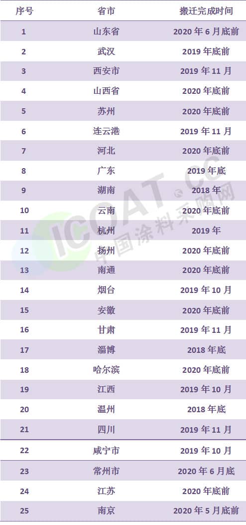 化工企業關停和搬遷是一個大工程,據中國涂料采購網了解,江蘇、山東、河北等省市需要關停和搬遷的化工企業達數千家,這其中所涉及的就業、經濟發展、搬遷補助問題等等都是影響整個搬遷進程的主要原因,對于很多化工企業來說“補償款”談不攏一切免談。但今非昔比,國家多部門聯合督促化工企業進行搬遷、改造升級、關停、安置,很多省部門文件當中,屢次提到“一律不批”、“一律關停”,力度之大由此可見。部分省市的搬遷、改造、關停時間如下表示:
