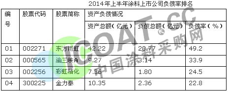 【中國涂料采購網】在很多時候,我們不管是對行業、企業發展進行評估、預測,看到的都是利好的一面,而有時候有些地方我們注意不到,而這些被我們忽略的地方往往最能反映出問題的真實性。2014年已進入最后的沖刺階段,此時,我們對2014年上半年涂料上市公司的總資產及負債率進行簡單的介紹。