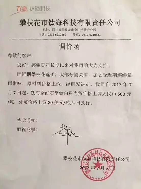 【中國涂料采購網】近日,國內鈦白粉龍頭企業龍蟒佰利在7月5日再一次上調鈦白粉價格,國內每噸上調300元,國際每噸上調50美元。而在此前鈦白粉巨頭日本石原、科慕、特諾(Tronox)剛剛在7月1日上調亞太地區各類鈦白粉價格。昨天龍蟒在漲價的提振下,股價大漲8.22%,帶動中核鈦白漲6.39%,金浦鈦業漲3.47%,安納達漲0.77%。