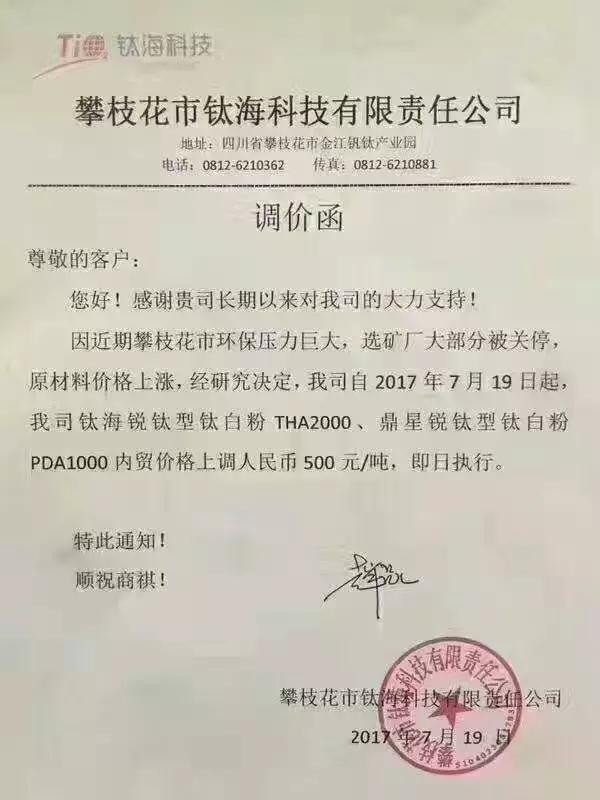 上漲的企業(yè)鈦海科技 7月19日起鈦白粉上調(diào)500元/噸;