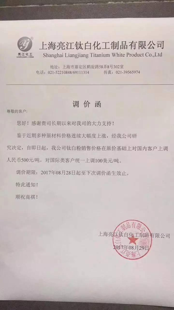 上海亮江鈦白化工制品有限公司,8月29日宣布其鈦白粉銷售價格在原價的基礎上對國內客戶上調500元/噸,對國際類客戶統一上調100美元/噸。