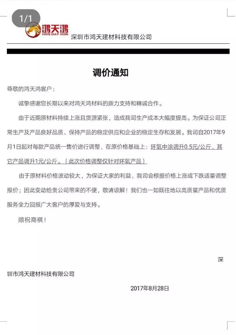 深圳鴻天建材科技有限公司,8月28日下發漲價通知函,決定自9月1日起對每款產品統一售價進行調整,在原價格基礎上:環氧中涂上調0.5元/公斤(合上調500元/噸),其它產品上調1元/公斤(合上調1000元/噸)。