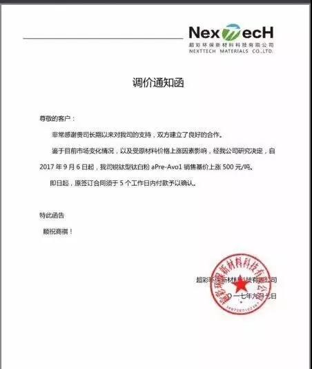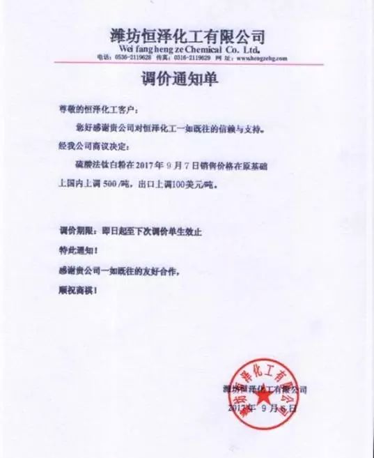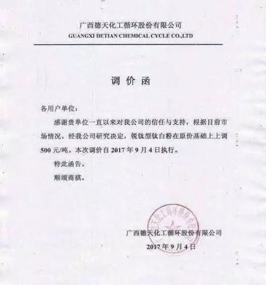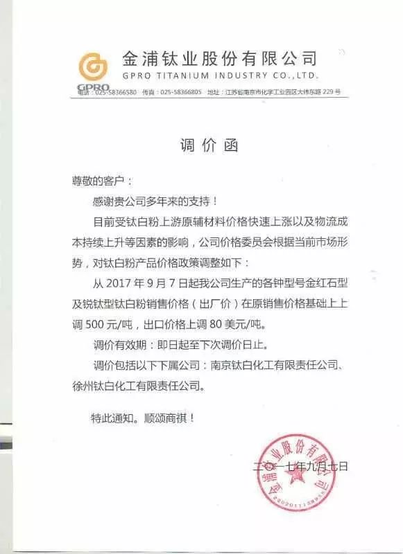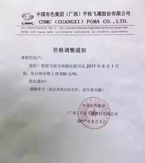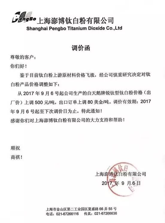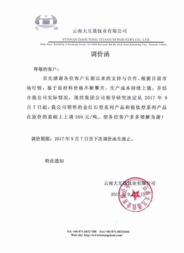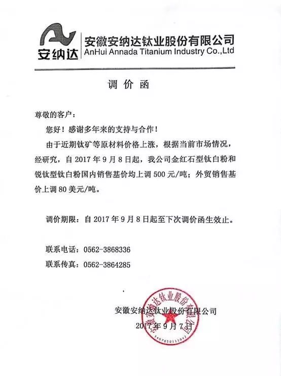 除國內(nèi)鈦白粉企業(yè)之外,國際巨頭科慕公司也發(fā)出鈦白粉提價(jià)公告。公告中稱,自10月1日起,科慕旗下所有規(guī)格的Ti-Pure™鈦白粉價(jià)格在中國大陸原有的基礎(chǔ)上上調(diào)150美元/噸(合計(jì)975元/噸)。
