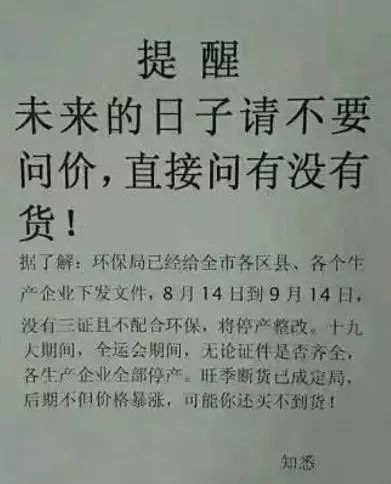 有錢未必能買到貨,各種漲價、限產、停產現象已經召示2017年是各行各業洗牌最殘酷的一年!近期第四批中央環保督察開始,8個督察組已陸續進駐。中央第二環境保護督察組和中央第三環境保護督察組分別入駐浙江省和山東省,召開督查工作動員會,督查時間為一個月。環保督察將進一步促進“散亂污”企業的關停,以及環保設備不完善企業的升級改造和整治,從而催生助推企業整治潮的來臨。