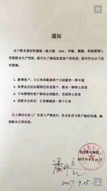 不只是環氧樹脂及其原料漲幅厲害,市場缺貨。據涂料采購網小編了解,其他眾多原材料貨源也很緊張,部分原材料出現庫存告急。國慶前夕,有不少原材料下游廠家提前備貨,出現原材料有價無貨、搶購現象! 不少企業為了生產的正常運轉,出臺了相應的應對措施,小訂單一律不發貨,資金不到位的,即便是老客戶也一律不發貨,虧本銷售的客戶一律斷供等方案,如,日前,華光粉末集團由于原材料緊缺,導致粉末生產受阻,為了確保優質客戶的供貨,對一些小客戶、誠信不是很好的客戶停止供貨。如下圖所示: