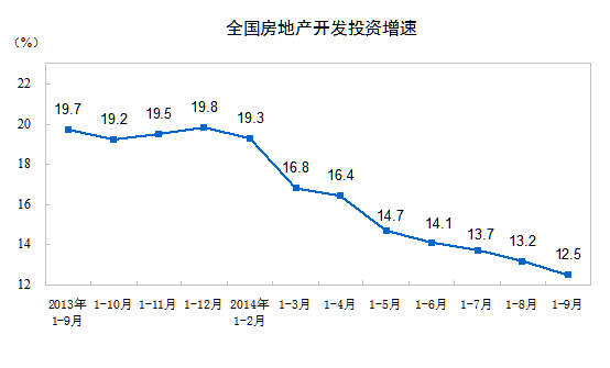 根據國家統計10月21日公布的房地產開發及銷售數據顯示, 2014年1-9月份,全國房地產開發投資68751億元,同比名義增長12.5%(扣除價格因素實際增長11.7%),增速比1-8月份回落0.7個百分點。其中,住宅投資46725億元,增長11.3%,增速回落1.1個百分點。住宅投資占房地產開發投資的比重為68.0%。