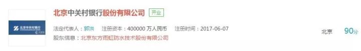 2017年6月7日,東方雨虹以1.92億元與用友軟件等11家共同投資注冊資金為40億元的北京中關村銀行股份有限公司(最終以國務院銀行業監督管理機構批準及工商行政管理部門核準的名稱為準,簡稱“北京中關村銀行”), 在金融領域進一步加碼!