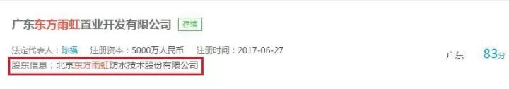 近年來房地產發展火熱,許多企業放棄實體經濟的發展而擠身于房地產投資。東方雨虹也不例外,相關資料顯示,今年6月27日,以北京東方雨虹防水技術股份有限公司為股東的廣東東方雨虹置業開發有限公司注冊成立,注冊資本為5000萬人民幣。