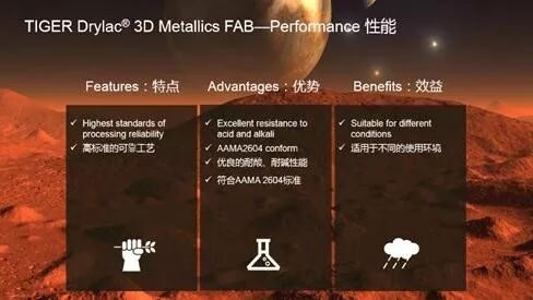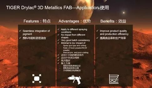 對于外資企業來說,探索、冒險是一種天性,當內資粉末涂料企業還在中低端市場廝殺時,老虎中國已在研發更高端的產品。經過十幾年兢兢業業的研發,3D Metallics新品終于亮相,不但在各項性能指標上都超越了常規的邦定金屬粉,而且實現“單涂多彩”、“立體高閃”的表面效果,最長可達20年不褪色、不變效果,并且取得了全球的專利。