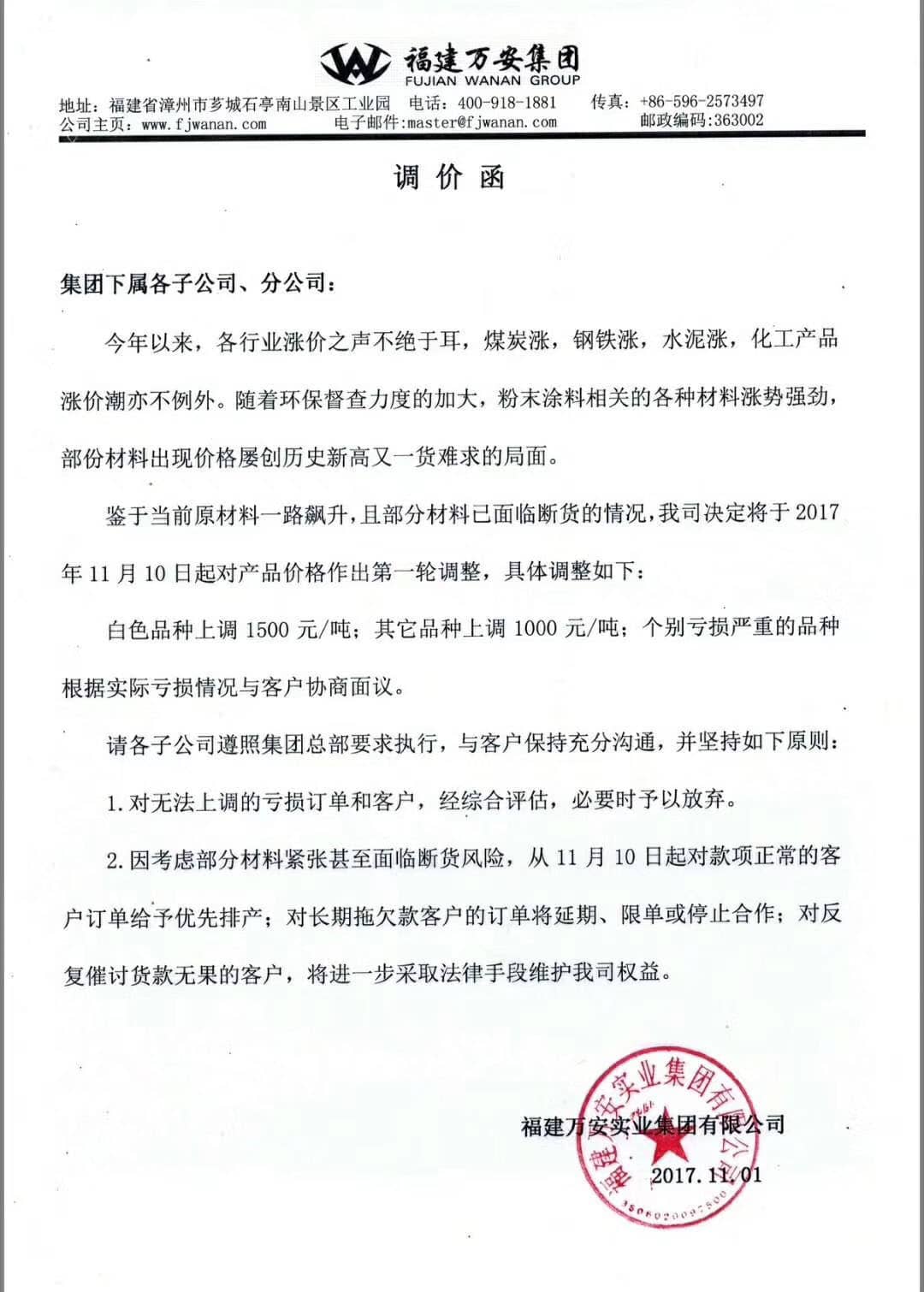 據中國涂料采購網了解,11月1日,國內粉末涂料行業(yè)龍頭企業(yè)福建萬安集團等粉末涂料企業(yè)宣布上調粉末涂料價格,上調幅度為1000元/噸-2000元/噸左右。另外據中國涂料采購網了解,國內部分化工園區(qū)因為環(huán)保問題進行限產,會導致國內環(huán)氧樹脂價格進一步上漲。業(yè)內人士透漏,國內環(huán)氧樹脂將會達到19000元/噸,至于漲勢能夠持續(xù)多長時間,主要取決于上游原材料價格的走勢。