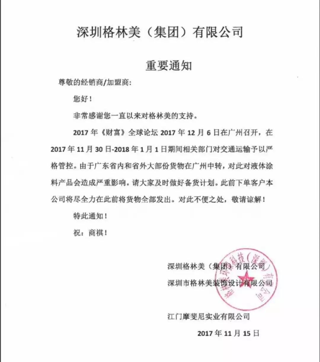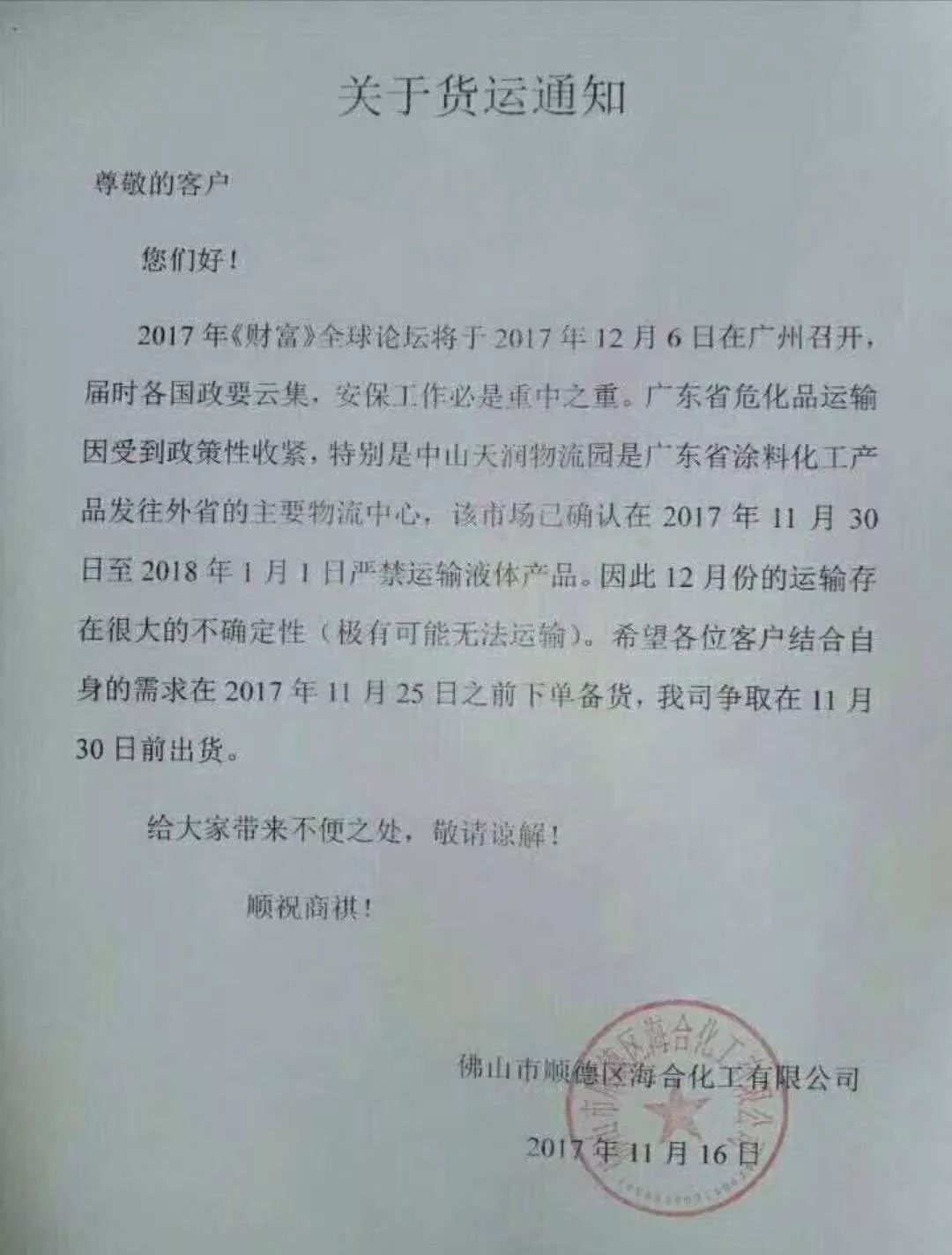 【中國涂料采購網】由于12月6日-8日全球財富論壇將在廣州召開及其他各種原因,在2017年11月30日至2018年1月1日嚴禁液態產品運輸。截止11月21日,廣東地區多家涂料企業集體下發了緊急通知,提醒客戶做好庫存準備。 廣東是我國涂料第一大省,共集聚2000多家涂料企業,此次時長1個月的禁運,將對華南地區的原材料、五金、家具、家電等行業造成重大影響。