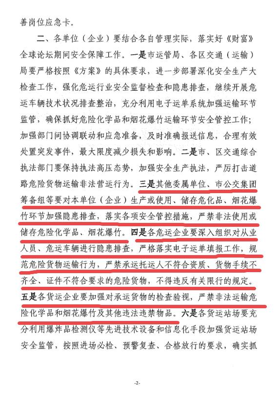 近日,廣州市交通委會員發(fā)布2017年廣州《財富》全球論壇期間危險化學(xué)品和煙花爆竹安全監(jiān)管工作方案的通知,明確了會議期間?;返倪\輸問題,全文如下: