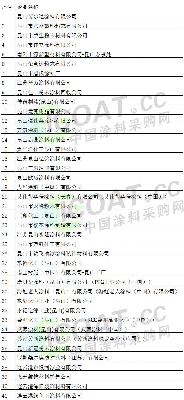 據(jù)中國涂料采購網(wǎng)信息中心消息,江蘇昆山及連云港地區(qū)部分涂料企業(yè)名單如下:
