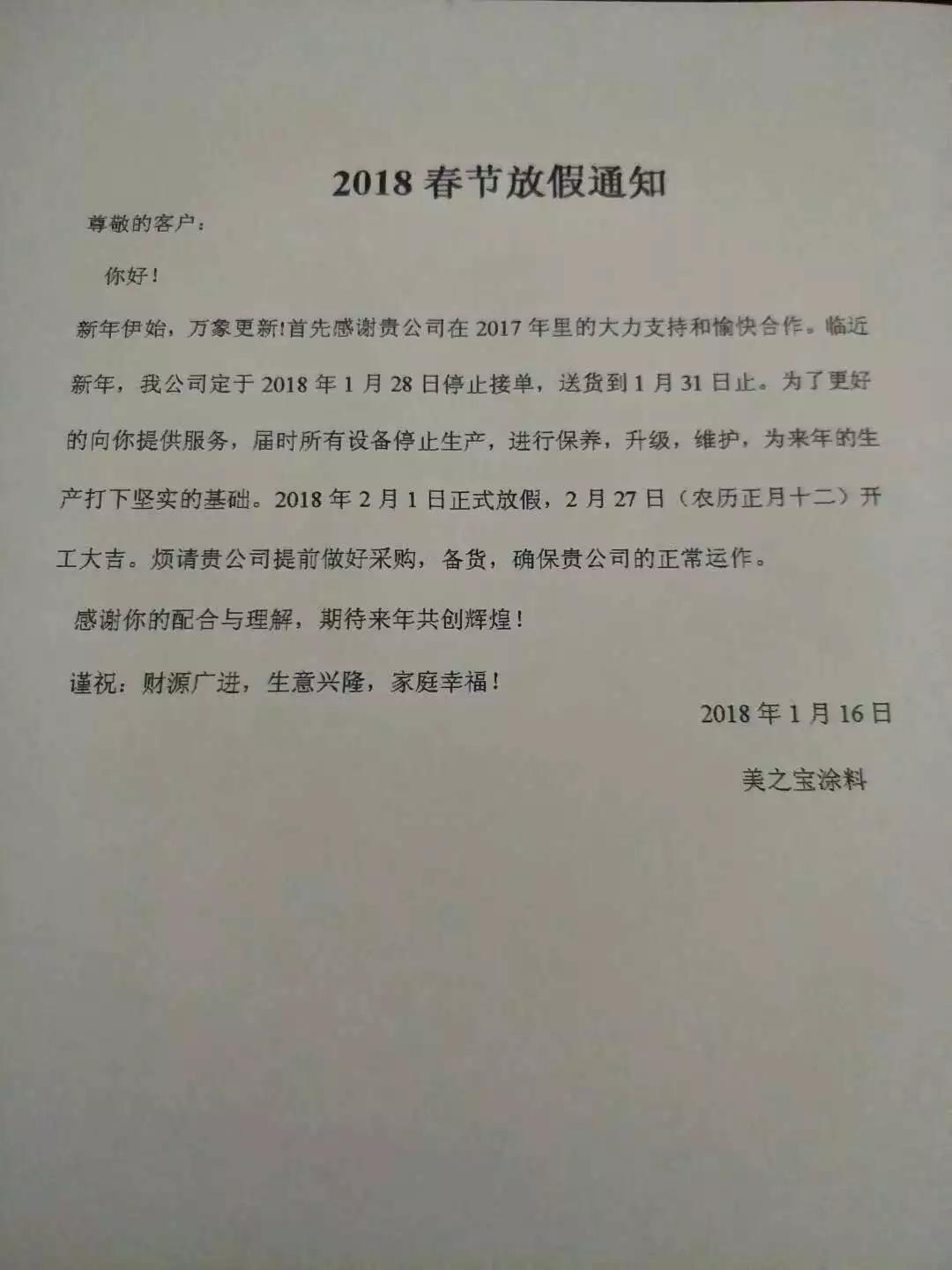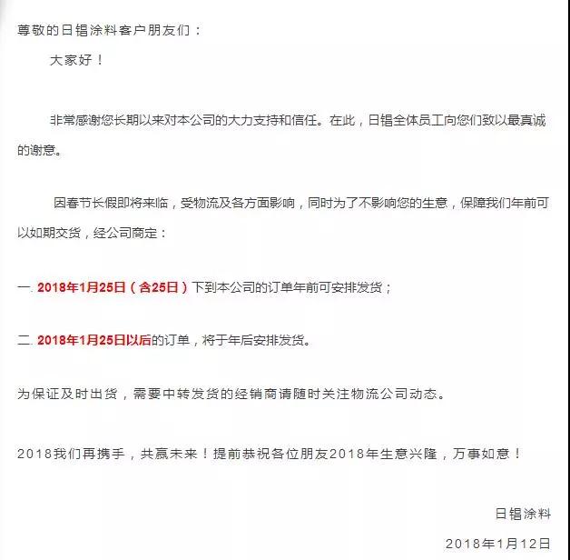 【中國涂料采購網】總結2017年涂料企業發展的關鍵詞,很多涂料企業表示:一個字“難”,兩個字“很難”,三個字“非常難”。很多中小型涂料企業在殘酷的競爭環境中選擇了放棄,有些涂料企業還在堅持。近日,中國涂料采購網收到各大涂料企業、原材料以及物流企業的2018年春節放假通知,通過對比,我們發現,2018年的春節假期普遍長于往年。很多涂料企業負責人表示:目前市場環境不好,不如給大家放一個長期,節后再說。目前大家對2018年的市場環境仍持悲觀態度。