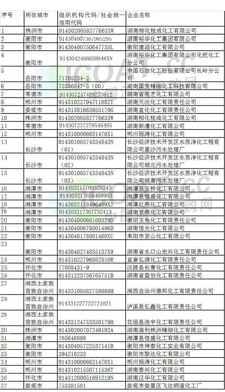 2017年湖南省重點監控污染源化工企業名單(37家)