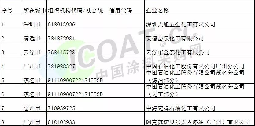2017年廣東省重點監控污染源化工企業名單(8家)