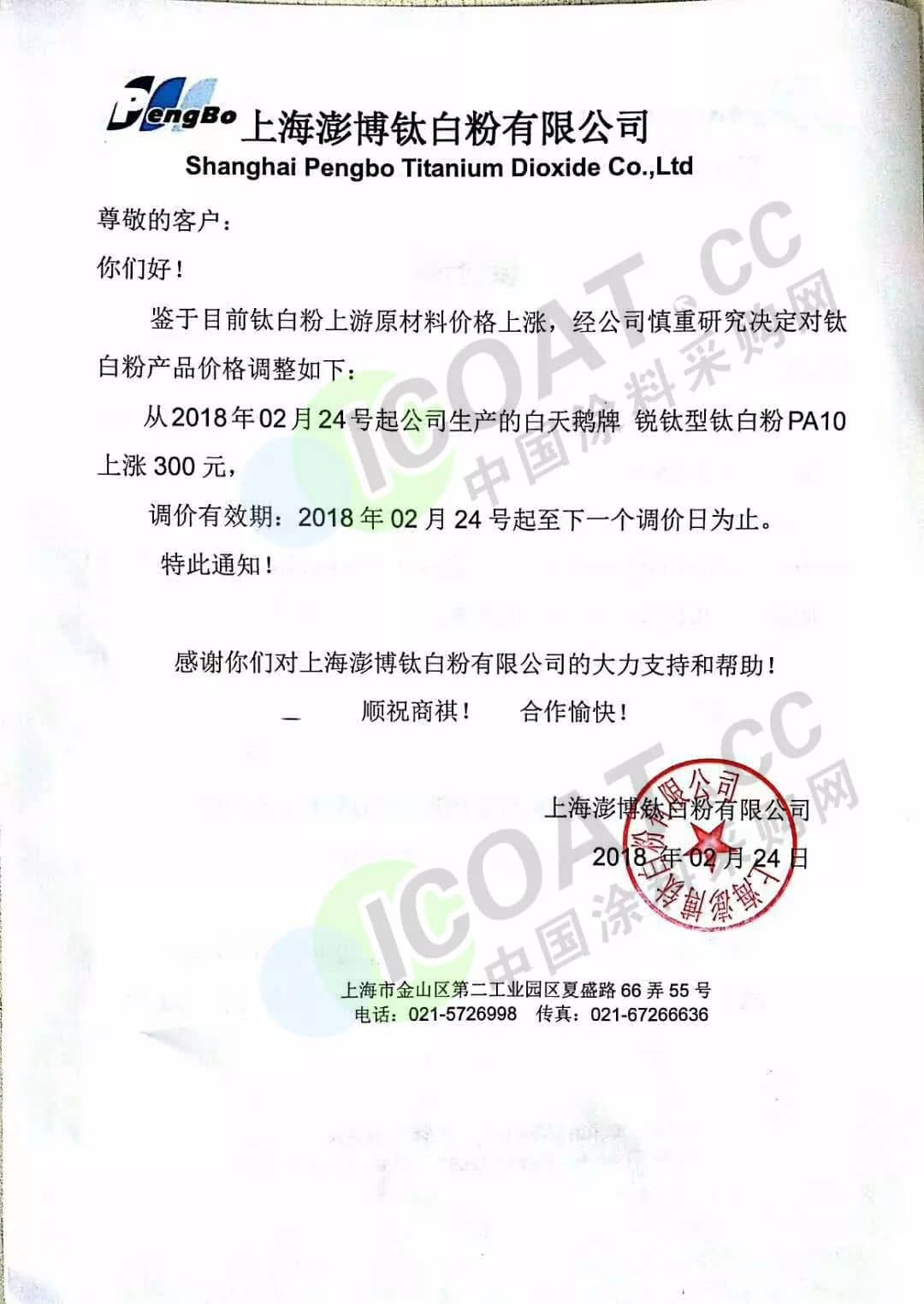 日前(2月24日),上海澎博鈦白粉宣布,鑒于目前鈦白粉上游原材料價格上漲, 2月24日起公司生產的白天鵝牌銳鈦型鈦白粉價格PA10上漲300元/噸。在春運和放假成為關鍵詞的歲末,化工品鈦白粉的漲價聲音引人關注。