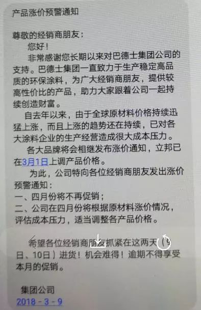 中國涂料采購網(wǎng)最新消息,3月9日巴德士發(fā)布產(chǎn)品漲價預警通知,繼廣東涂料企業(yè)漲價消息發(fā)布之后 ,展辰集團于3月13日率先發(fā)布“關于對產(chǎn)品銷售價格進行調(diào)整的通知”,宣布4月1日起對產(chǎn)品銷售價格上調(diào)5%以上(部分品種上調(diào)10%以上)。