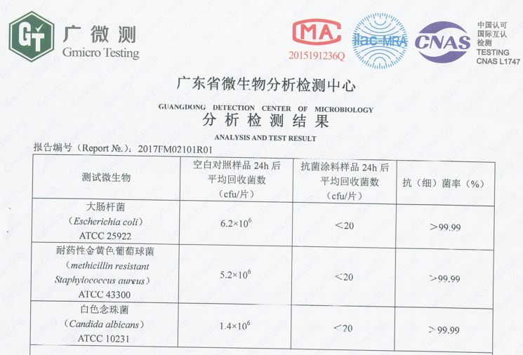 多年以來,內(nèi)資涂料企業(yè)在技術(shù)研發(fā)方面始終落后外資涂料企業(yè),但是礪劍超能打破了內(nèi)資涂料企業(yè)無法超越外資涂料企業(yè)的“神化”。據(jù)中國涂料采購網(wǎng)了解,礪劍超能研發(fā)的除醛滅菌涂料,防霉抗菌等級達(dá)到國家最高等級0級(即顯微鏡下觀察未見生長)。抗霉菌耐久性能0級(UV測試環(huán)境下100H)。抗菌率高達(dá)99.99%以上(含耐藥性病菌)。在涂刷八小時(shí)內(nèi)催化PM2.5 效率達(dá)96.7 %,有效催化TVOC(含 PM2.5)、游離甲醛、苯、氨等有害物質(zhì)。