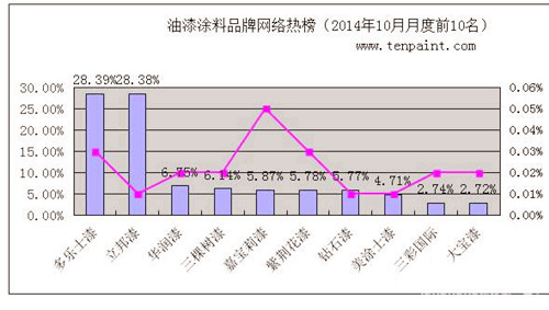 從本月TOP10榜單排名情況來看,處在前三位的依然是多樂士漆、立邦漆和華潤漆,只是排名略有變化:多樂士漆以28.39%的受關注度擠掉立邦漆,從上月的第二上升至第一,環比增加0.03%,同比增加2.54%;不過立邦漆在本月依然表現出色,熱搜值為28.38%,僅次于多樂士漆0.01%,環比較上月增加0.01%,位居第二,同比增加2.08%;華潤漆強勢依舊,以6.75%的受關注度進入前三,是TOP10里除去多樂士和立邦之外的品牌中表現最好的,同比增加0.95%。