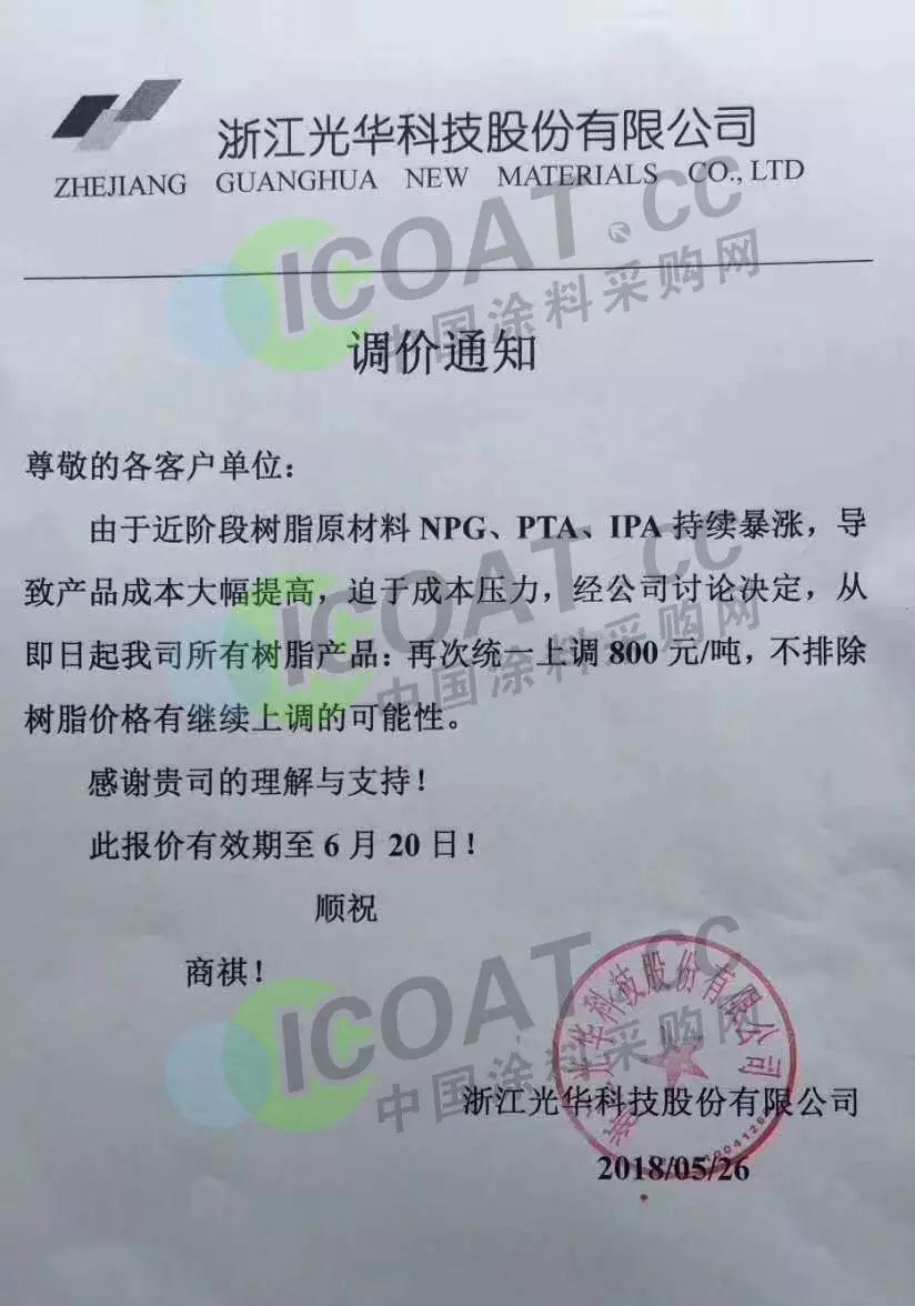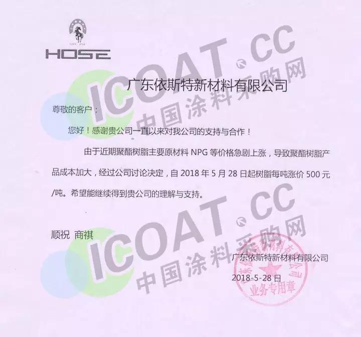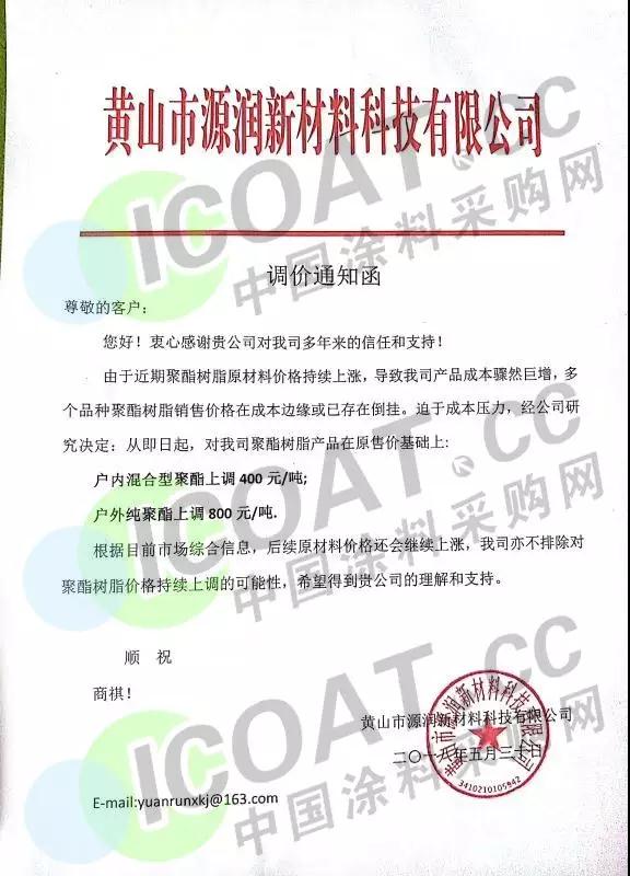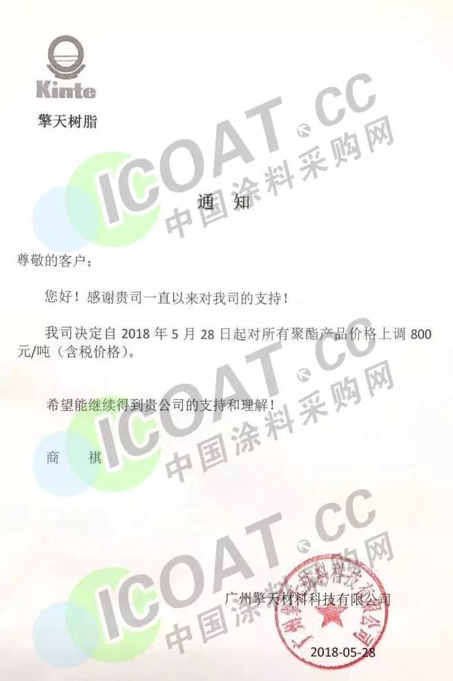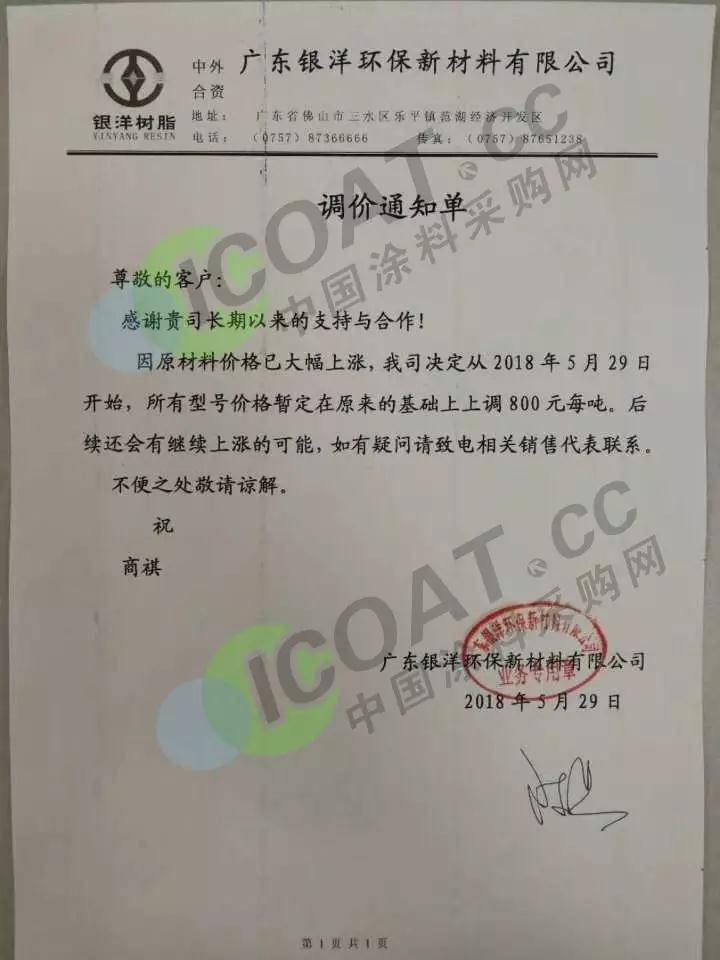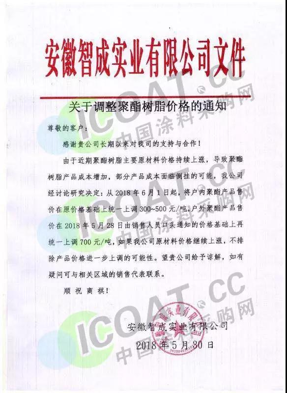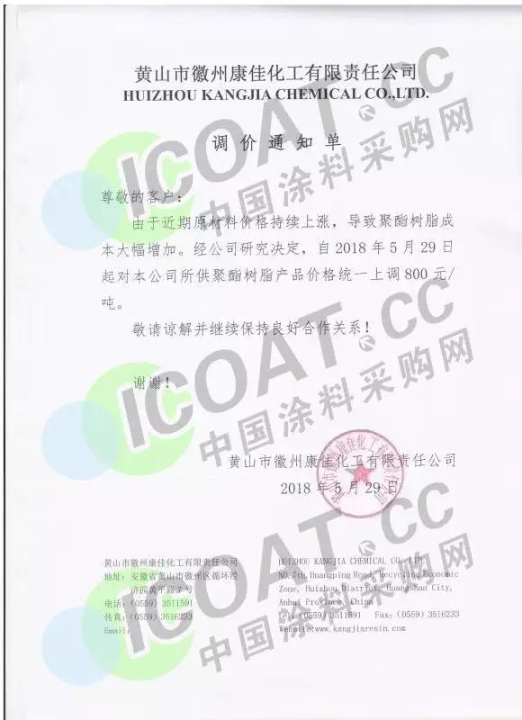 】據涂料采購網了解,自2018年5月26日以來安徽智成實業、廣州擎天、廣東銀洋、浙江光華等12家樹脂企業宣布上調價格,本輪漲幅基本在300~800元/噸左右。