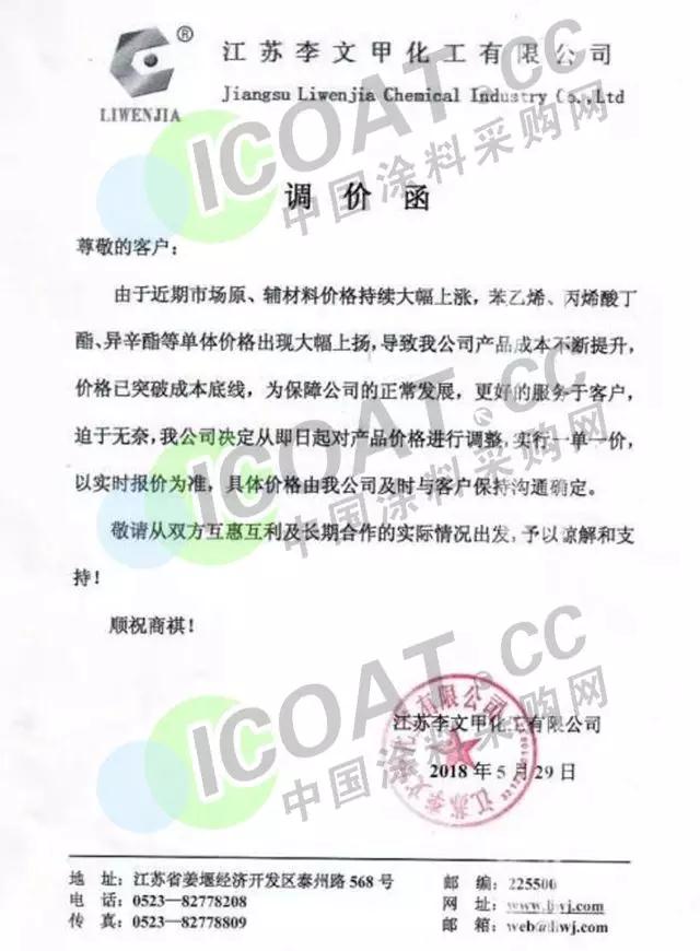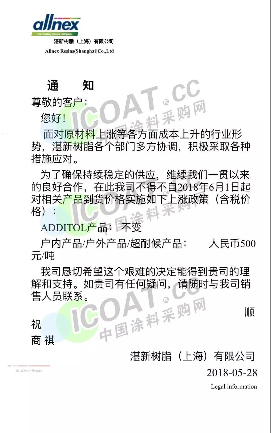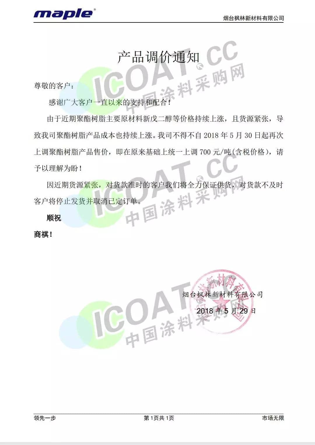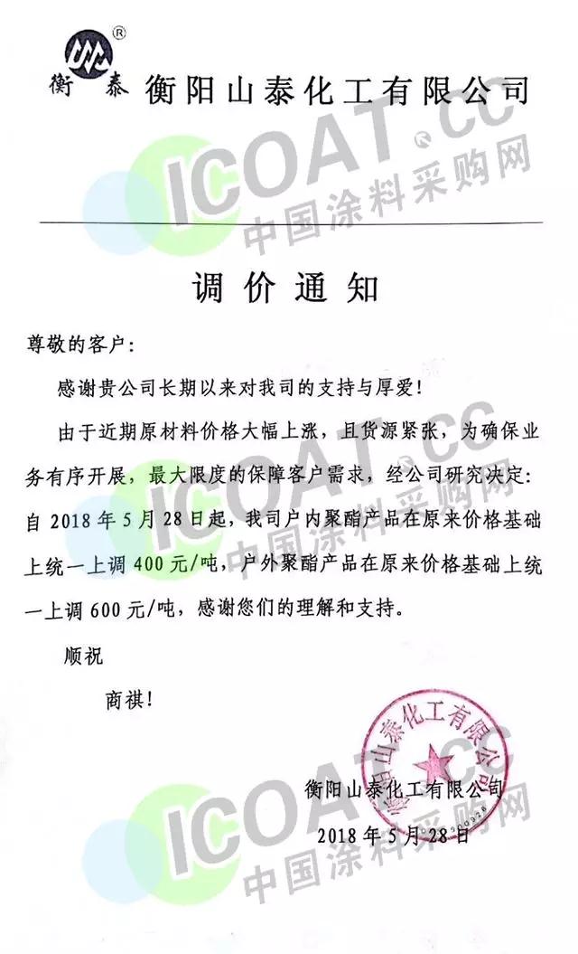 】據涂料采購網了解,自2018年5月26日以來安徽智成實業、廣州擎天、廣東銀洋、浙江光華等12家樹脂企業宣布上調價格,本輪漲幅基本在300~800元/噸左右。