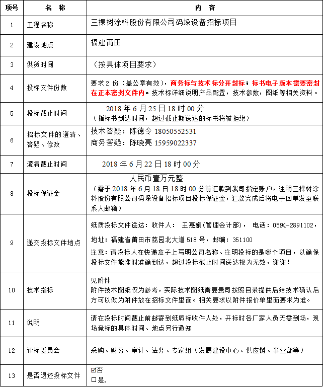 鑒于目前涂料采購網在行業中的影響力,三棵樹涂料6月8日通過涂料采購網對碼垛設備、冷卻塔等設備進行公開招標。