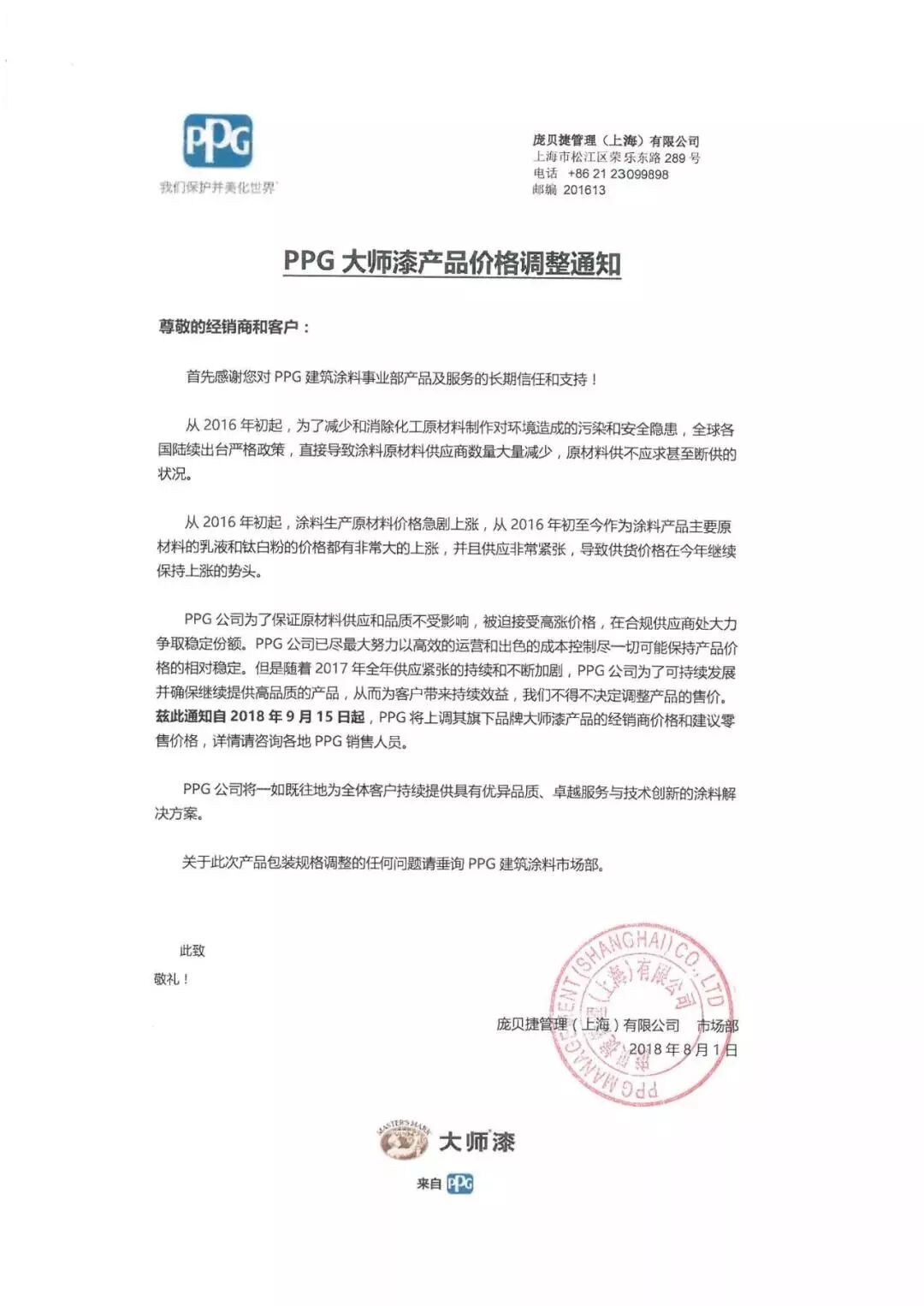 8月1日,龐貝捷管理(上海)有限公司發布PPG大師漆產品調價函,自2018年9月15日起,PPG將上調其旗下品牌大師漆產品的經銷商價格和建議零售價格,詳情需咨詢各地PPG銷售人員。通知如下: