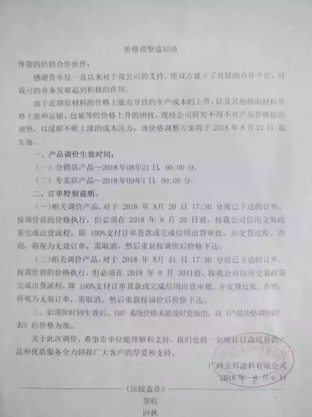 據了解,為緩解不斷上漲的成本壓力,國際巨頭涂料企業立邦也于近日發布了調價函,該價格調整方案將于2018年8月21日起實施。通知如下: