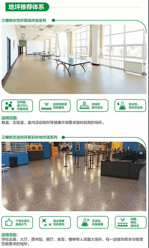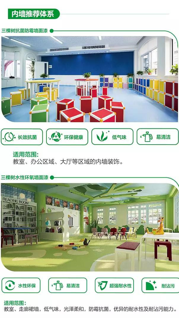 三棵樹首推綠色校園系列產品,符合極致健康的理念,VOC、甲醛含量遠低于十環標準要求,輔以先進的配方技術,特別適用于校園的內部涂裝。