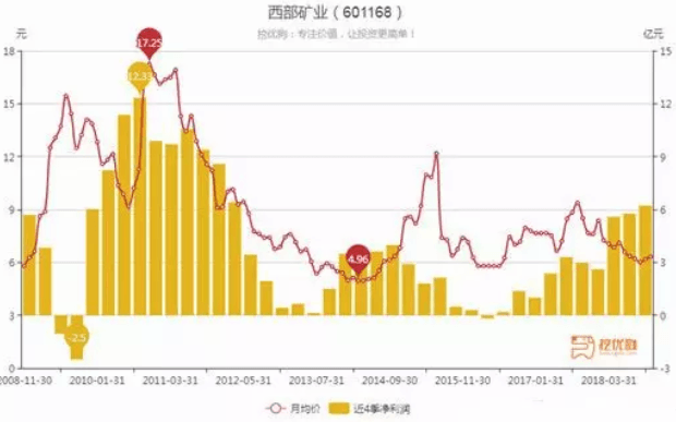 上圖是西部礦業(SH:601168)2008年11月至2018年11月的凈利潤表現和月均股價,可以深刻感受到行業周期的支配與拉拽,企業只能隨著周期的起伏而起伏。
