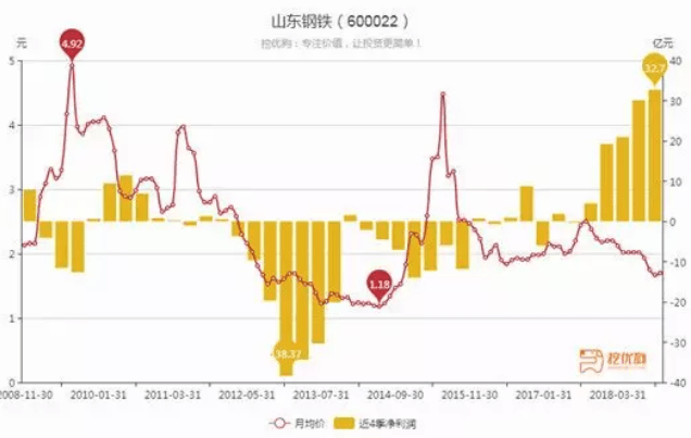 當企業發展一段時間后,一旦周期遇冷,利潤便會被強力拉回,甚至是一夜回到解放前。十年時間企業的利潤水平只能在一個范圍內反復波動,仿佛被戴上了沉重的枷鎖。而股價伴隨著行業周期,從十年前5.8元的月均價到今天波動在6.3元的位置上。再來看另一只公認的周期股山東鋼鐵的盈利歷史和股價歷史: