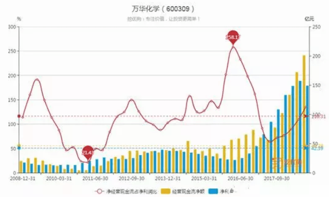 一是萬華凈利潤的現金含量充足,08年至16年的歷史區間內平均每1元凈利潤都有1.23元的經營現金流凈額來支撐,說明利潤表上的利潤是實實在在掙到的真金白銀,利潤質量較高;