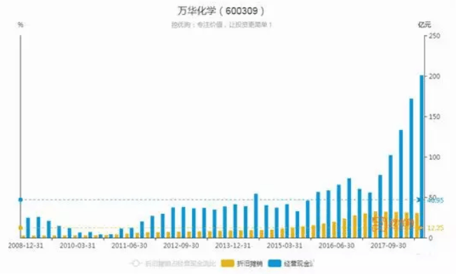 當然,簡單的頭尾節點比較還不足以說明問題,甚至利潤也可以粉飾調整,我們更需要關注的是背后的價值增長能力。因此我們把萬華的凈利潤、經營活動現金流凈額以及固定資產折舊、攤銷放在一起比較,觀察萬華經營成果的含金量與持續性。