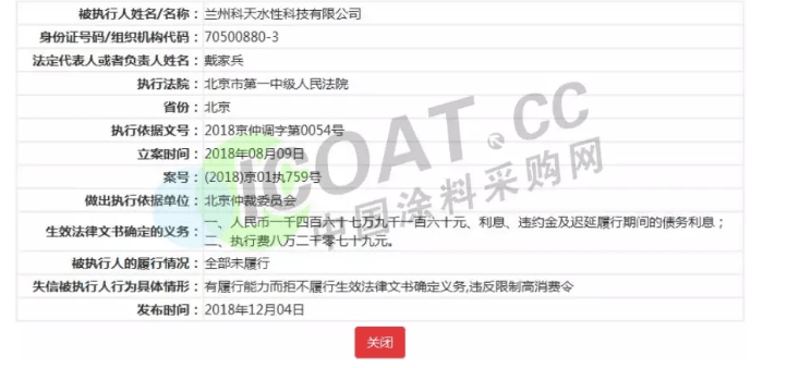 2018年7月份,有網(wǎng)友向涂料采購(gòu)網(wǎng)舉報(bào),涂料行業(yè)知名企業(yè)“蘭州科天集團(tuán)”旗下全國(guó)多個(gè)子公司如“合肥科天眾宜家具有限公司”、“合肥水性科天營(yíng)銷中心”等疑似陷入欠薪風(fēng)波。