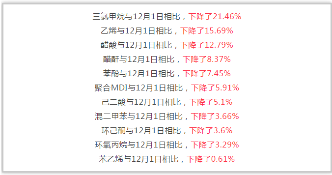 與國外化工企業(yè)形成顯明對比的是,國內(nèi)原材料價(jià)格出現(xiàn)大幅度下滑,如: