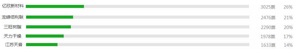 通過本次活動,涂料采購網發現,億欣新材料、龍蟒佰利聯、三旺樹脂、天力干燥、江蘇天音等企業人氣最旺,成為本次網絡投票活動中人氣較多的企業,投票占比情況如下:
