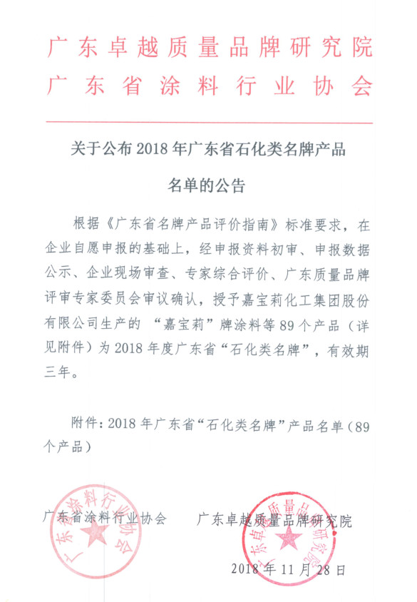 根據(jù)《廣東省名牌產(chǎn)品評(píng)價(jià)指南》標(biāo)準(zhǔn)要求,在企業(yè)自愿申報(bào)的基礎(chǔ)上,經(jīng)申報(bào)資料初審、申報(bào)數(shù)據(jù)公示、企業(yè)現(xiàn)場(chǎng)審查、專家綜合評(píng)價(jià)、廣東質(zhì)量品牌評(píng)審專家委員會(huì)審議確認(rèn),授予嘉寶莉化工集團(tuán)股份有限公司生產(chǎn)的“嘉寶莉”牌涂料等89個(gè)產(chǎn)品(詳見附件)為2018年度廣東省“石化類名牌”,有效期三年。