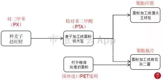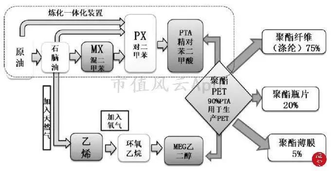 PTA的主要需求是滌綸(聚酯纖維),約占到PTA總需求的75%,其次是聚酯瓶片約占到20%,這個產(chǎn)業(yè)鏈流程圖如下: